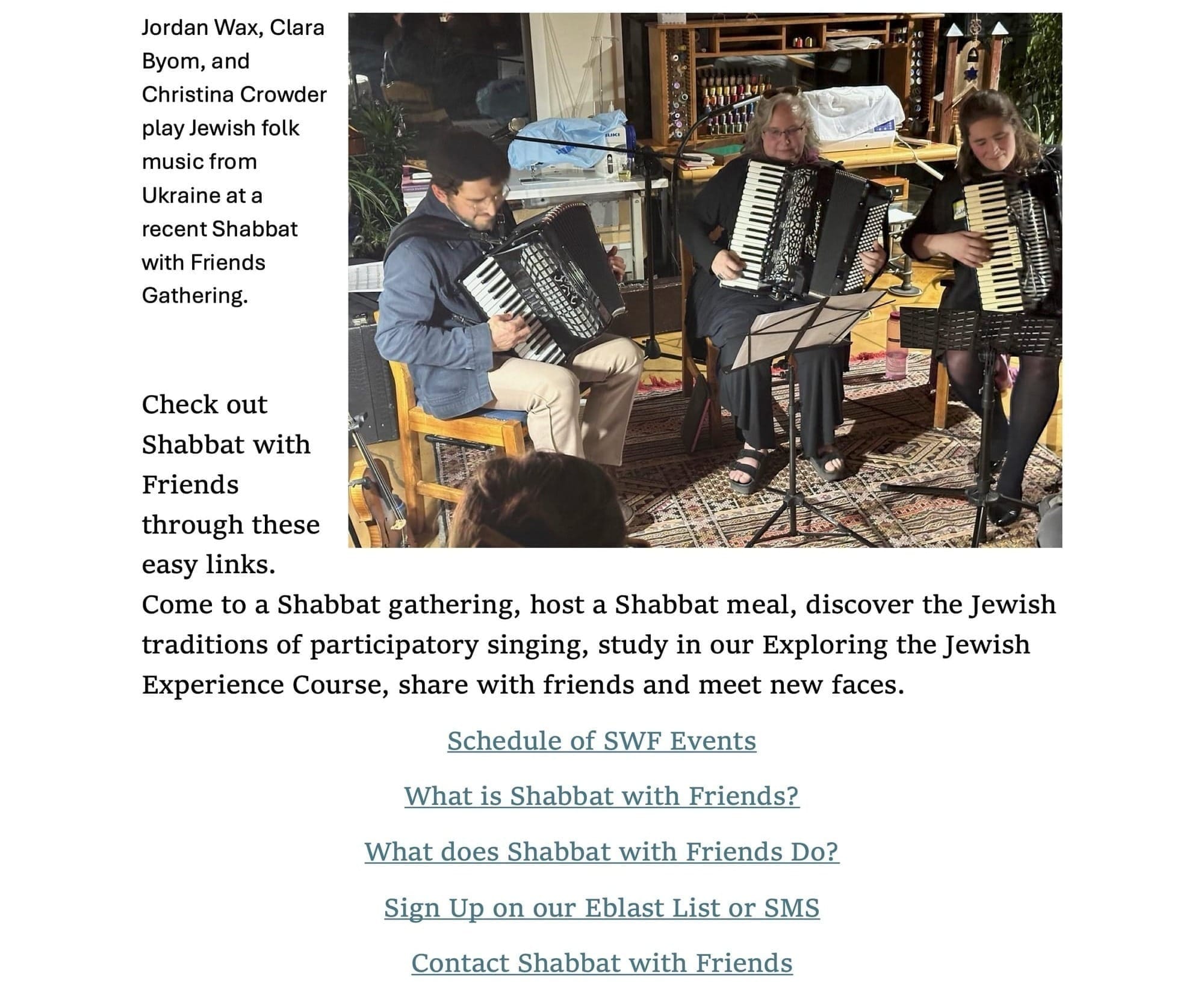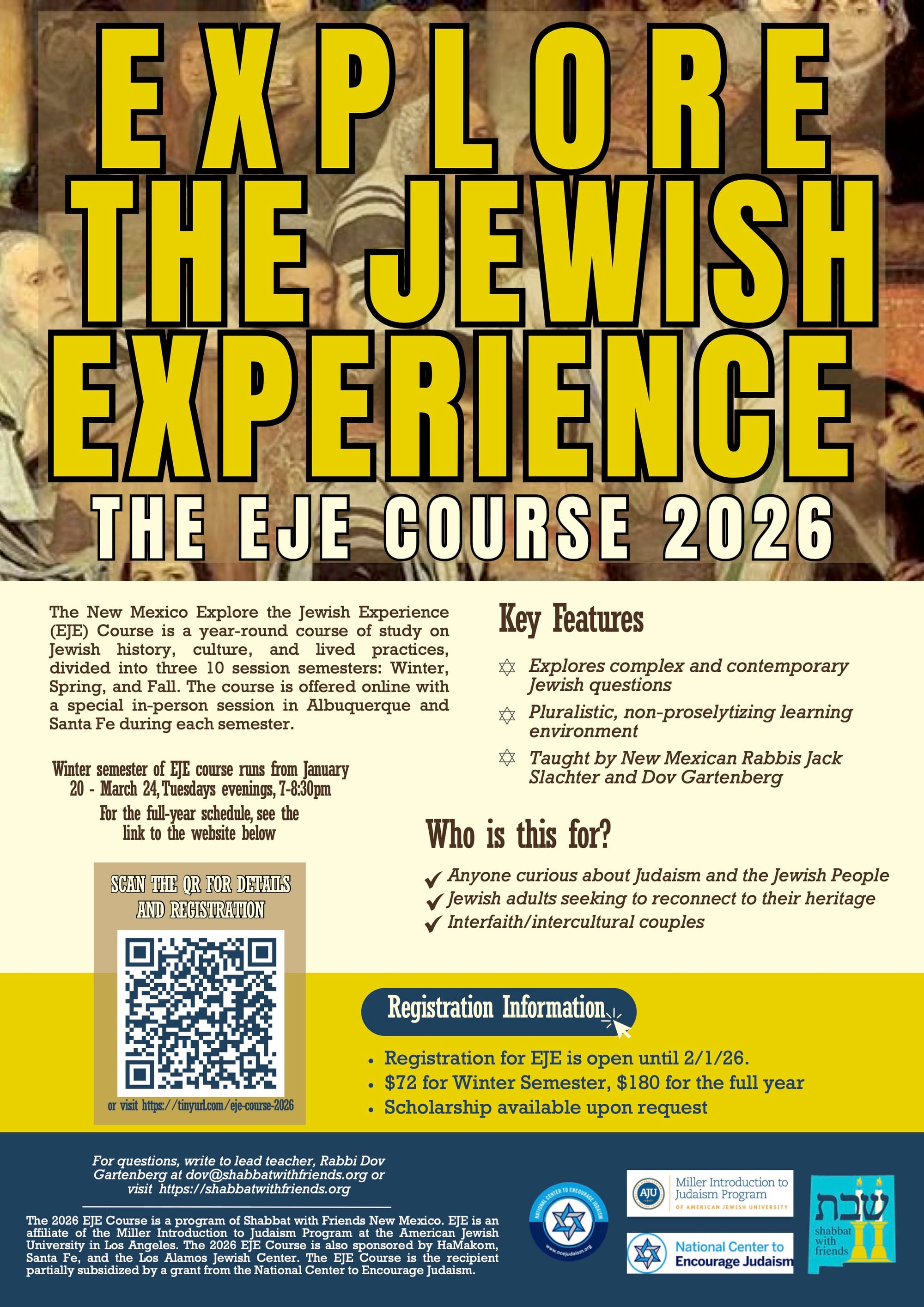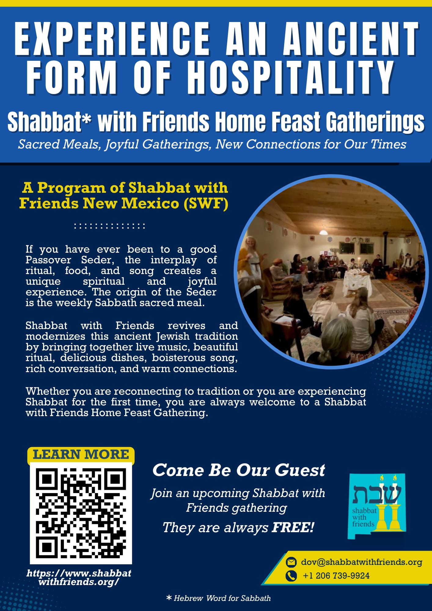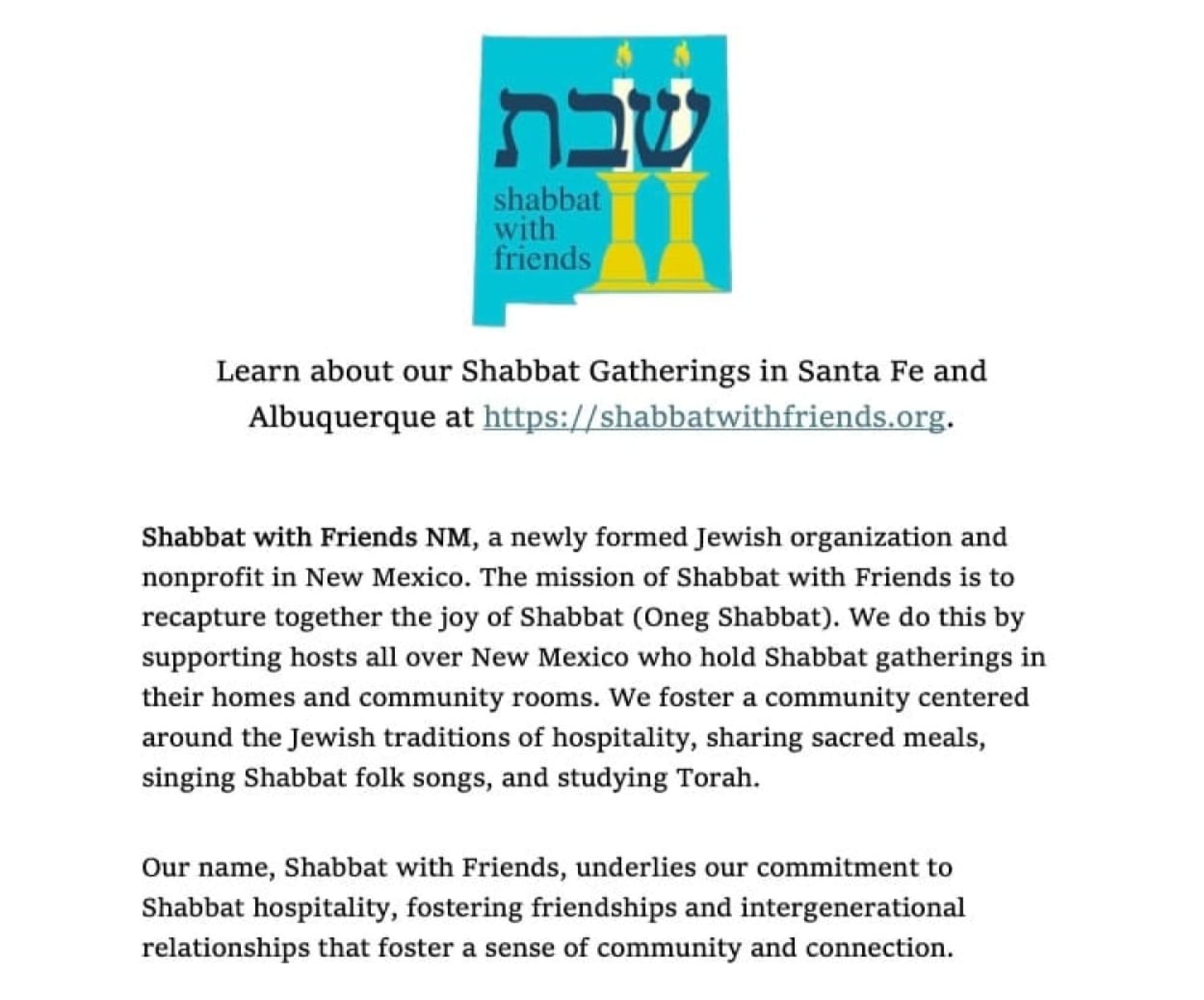 Learn about our Shabbat Gatherings in Santa Fe and Albuquerque at https://shabbatwithfriends.org. The mission of Shabbat with Friends is to recapture together the joy of Shabbat (Oneg Shabbat):