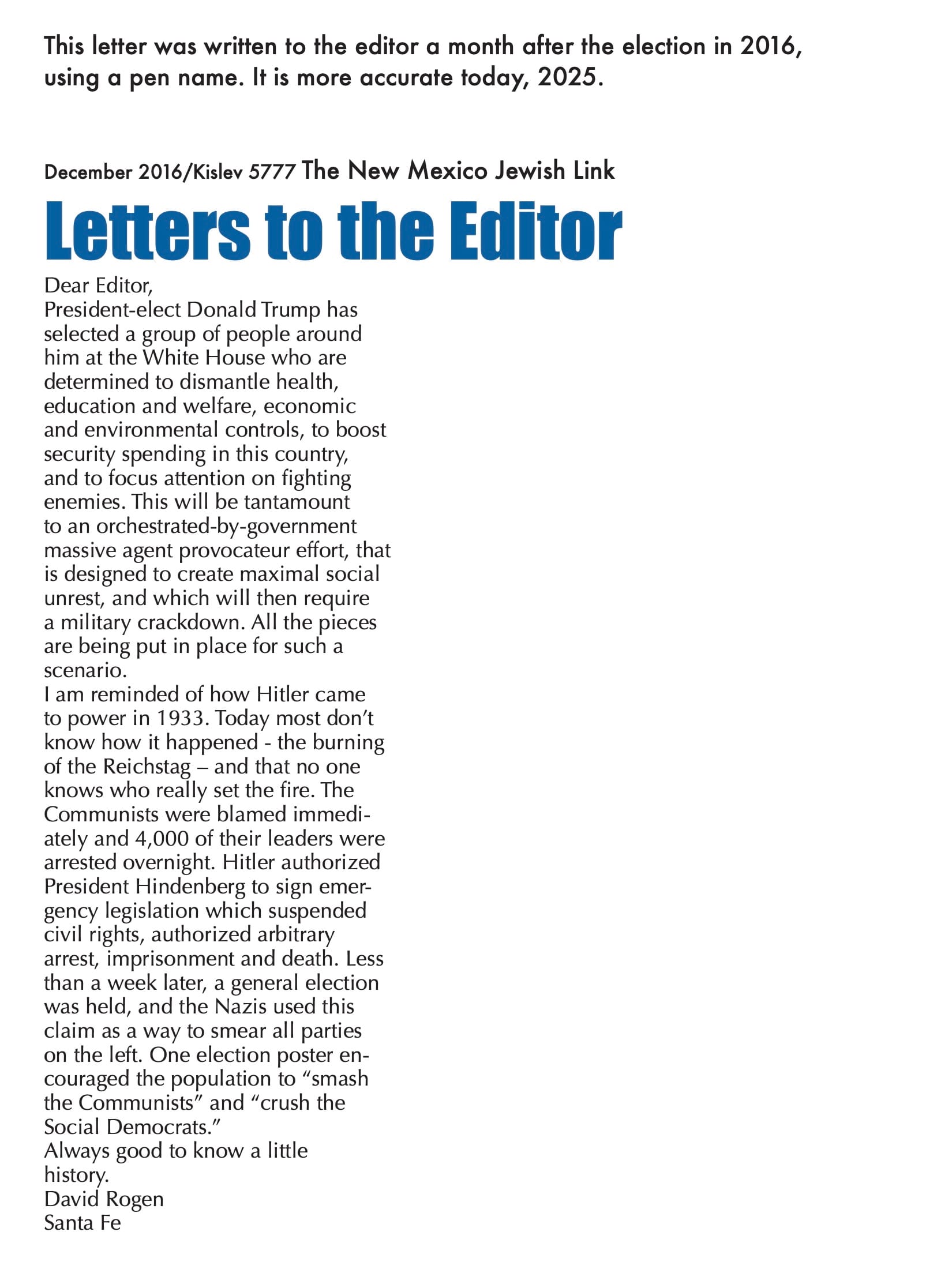 Editor's Note: See a letter to the editor from 2016 below that foretold that Trump would orchestrate a state of emergency to lead to martial law, in the now-defunct New Mexico Jewish Link, the federation-owned paper that ceased to exist in 2022 after 55 years when the NM Federation closed. Written by yours truly, former senior correspondent for the NMJL, it was only allowed to be published under a pen name.