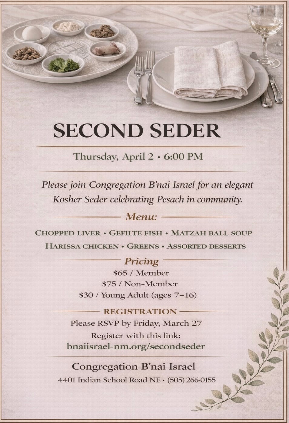 RSVP FOR B'NAI ISRAEL 2nd Night Seder by MAR 27th!
