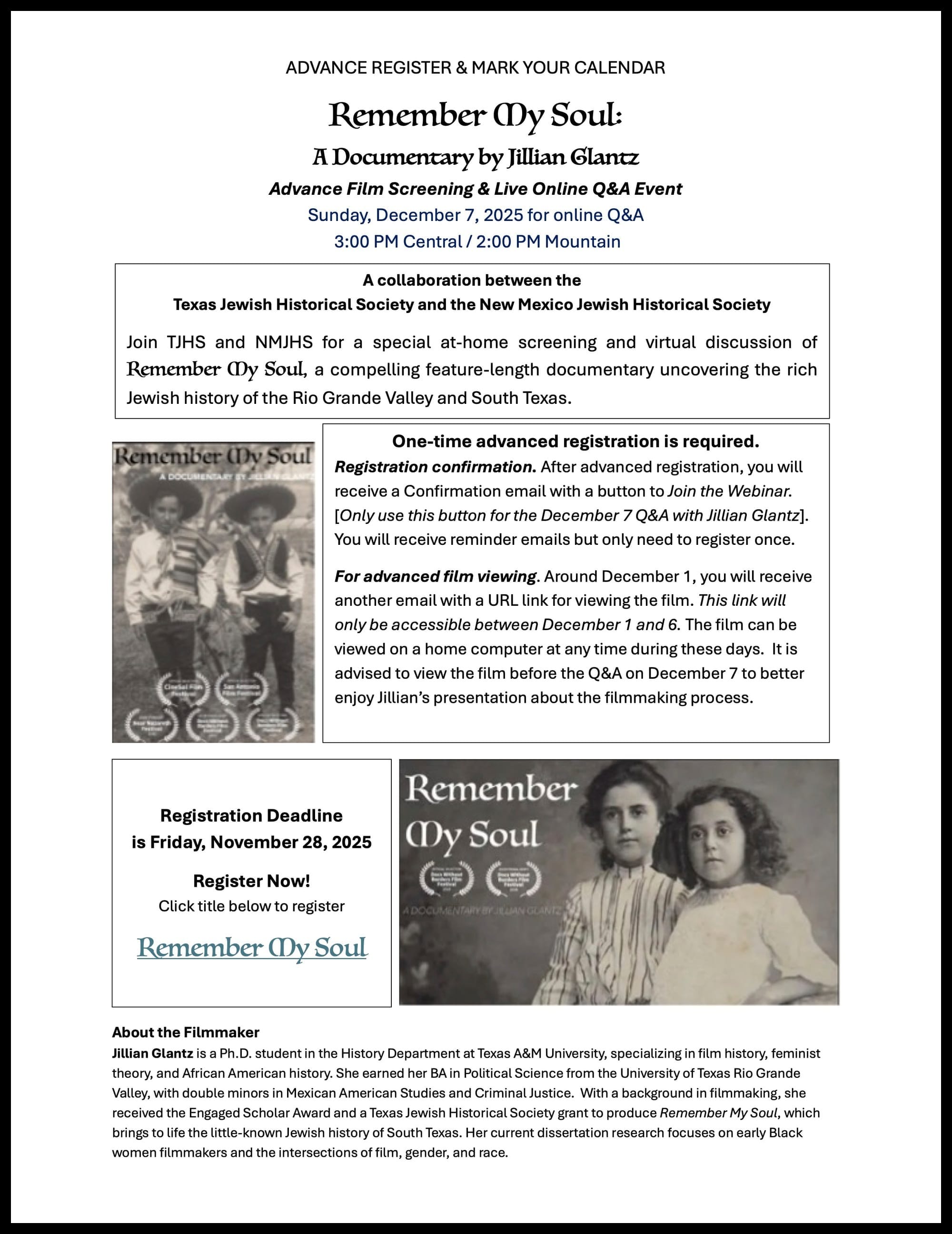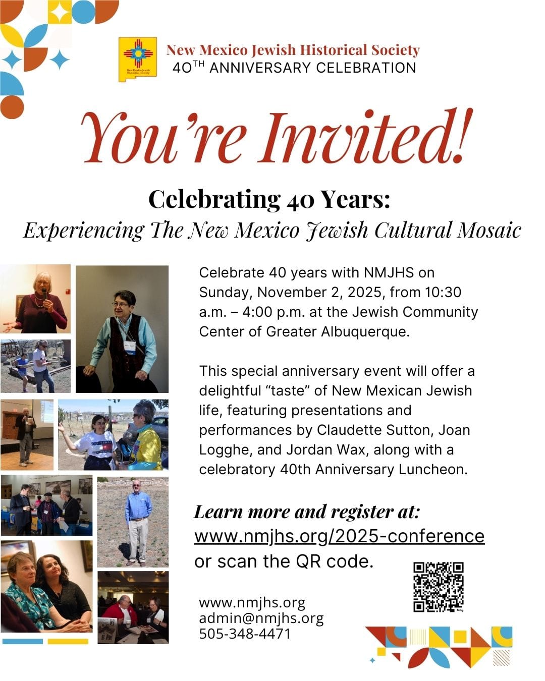 NM JEWISH HISTORICAL SOCIETY ~ RSVP by Oct 27!!!! FALL CONFERENCE Nov. 2, 40th Anniversary ~ Film "Remember my Soul" Dec. 7th ~ New SPEAKERS BUREAU! ~ Rabbi Jack Shlachter "18 Jewish Artists" Jan. 20, 2026
