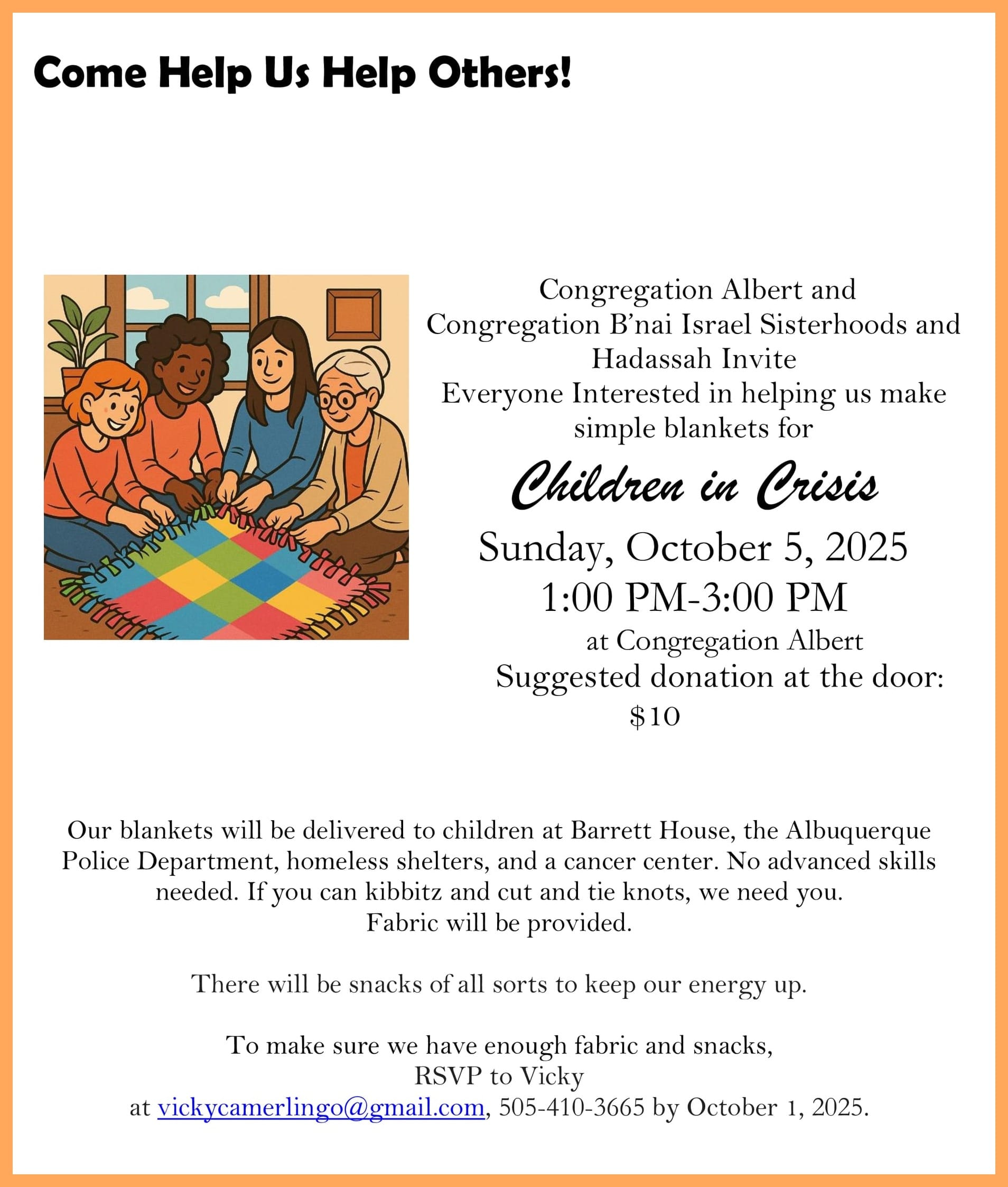CONGREGATION B'NAI ISRAEL ~ Blanket Project Oct. 5th ~ Sukkot BBQ OCT 12th 6 p.m. RSVP NOW! ~ ACADEMY of JEWISH LEARNING Register Now! ~ See Complete Calendar