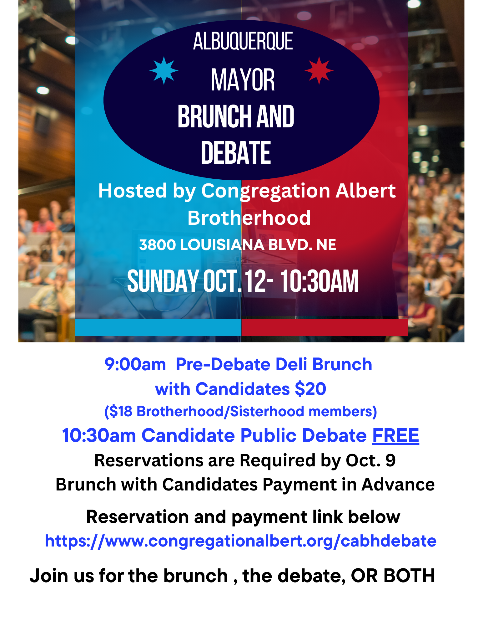 CONGREGATION ALBERT ~ ABQ MAYOR DEBATE OCT. 12 Brunch and Debate ~ SCHOOL OF JEWISH STUDIES Register Now! ~ Jewish life in Albuquerque