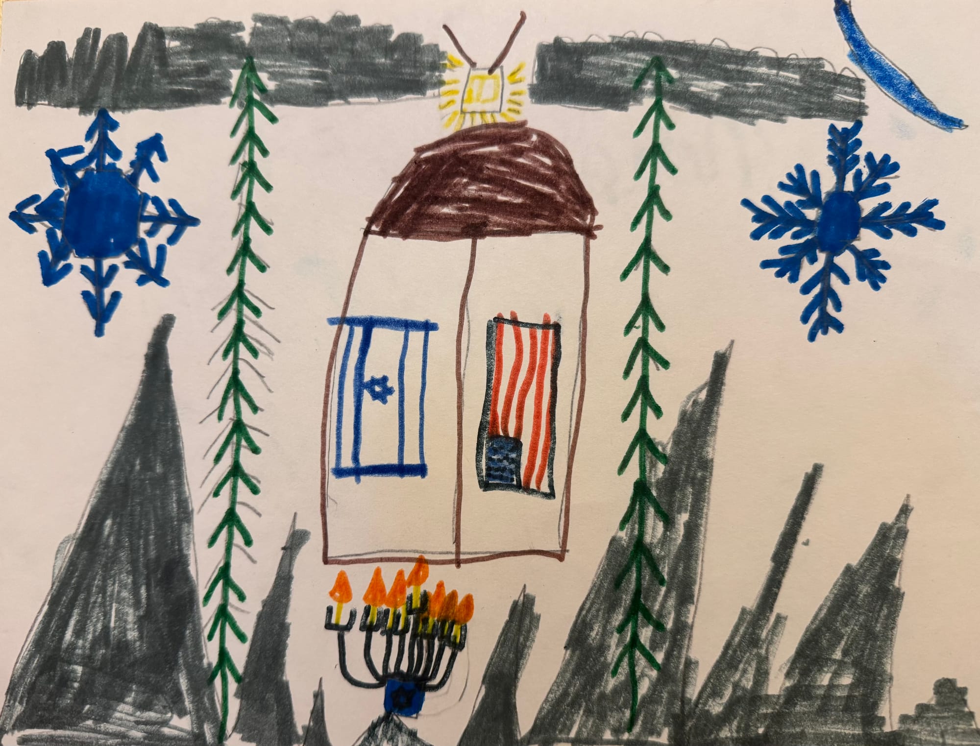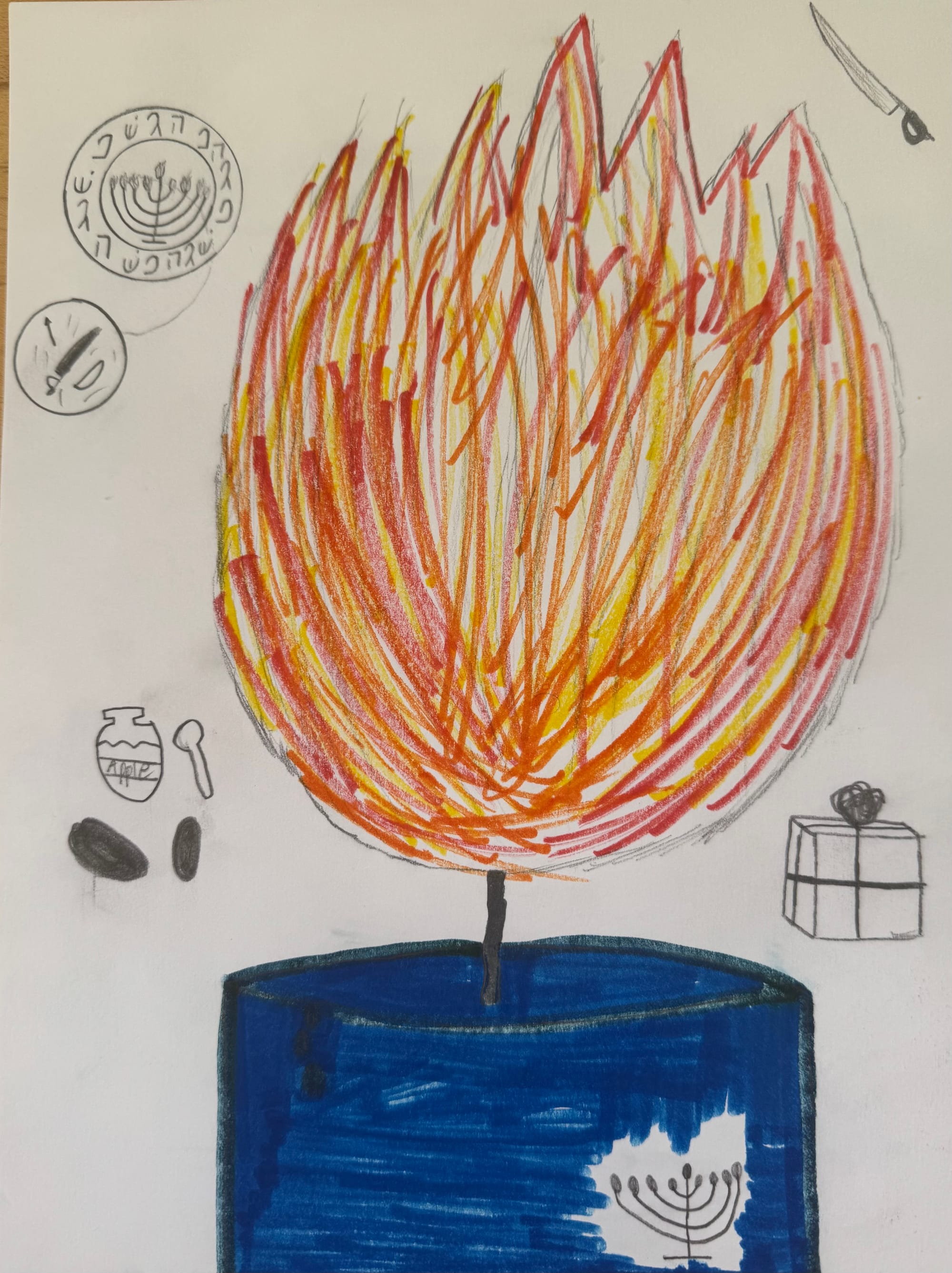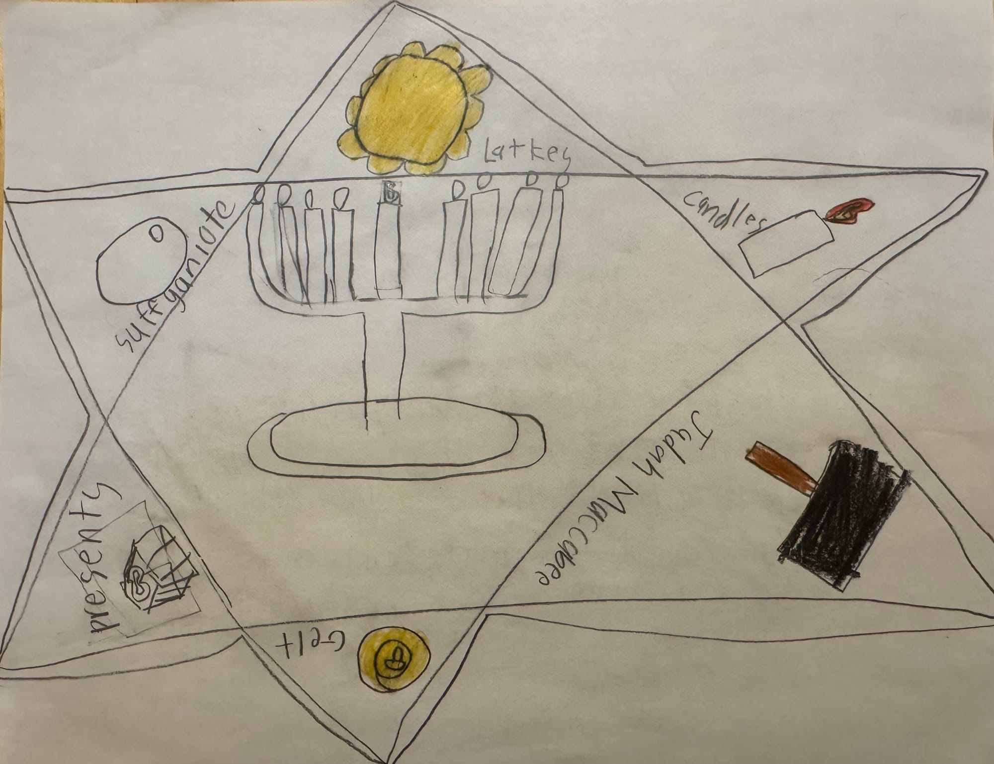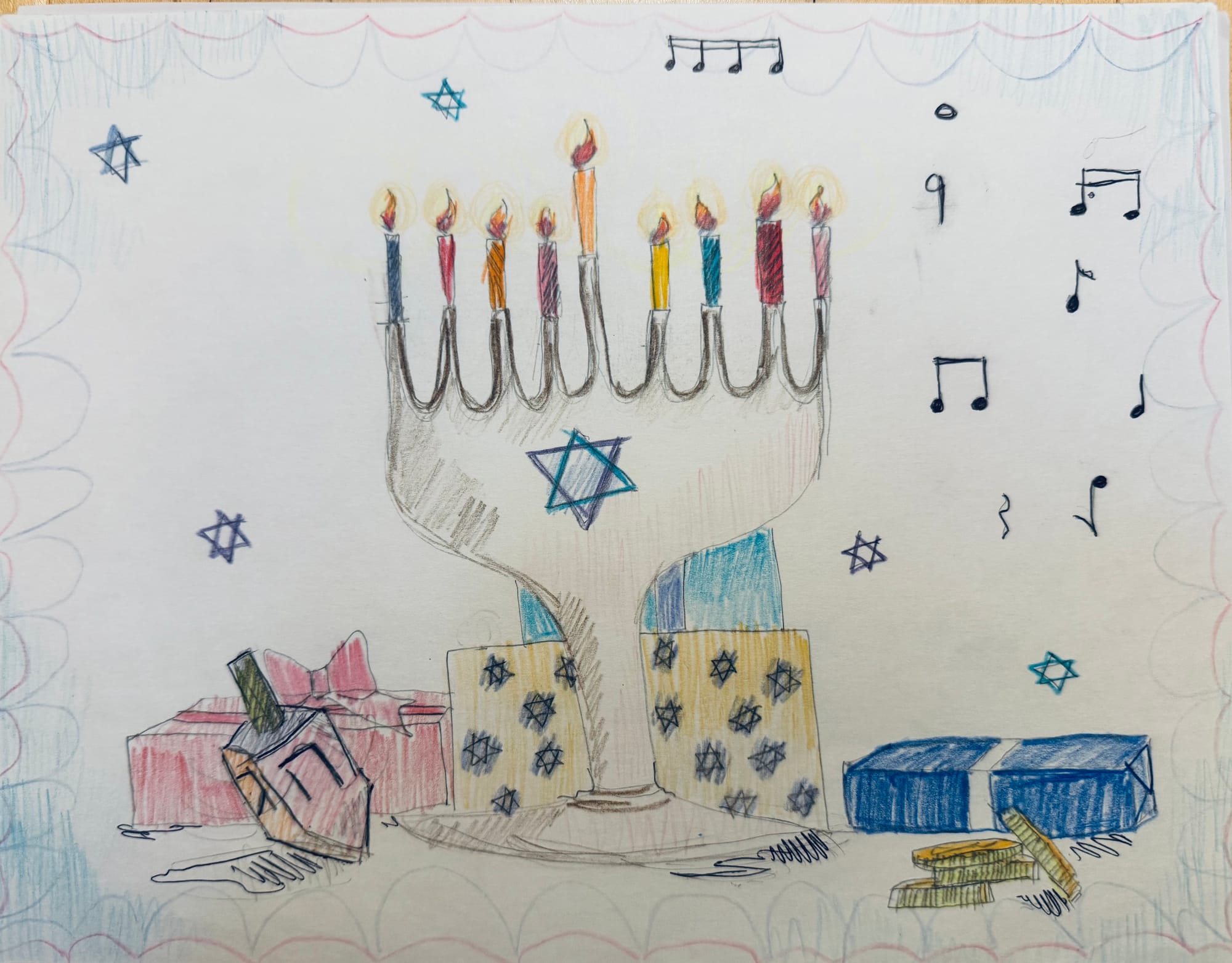 Chanukah artwork, Academy of Jewish Learning, Torah Class Grades 3rd-7th, Congregation B'nai Israel, Albuquerque, Artwork © by artists Jack (3rd), Chavah (3rd), Miriam (4th), Noah (4th), Jacob (7th), and Iris, 11th grade, class Aid. Facilitators Morah Nikki I. and Maggidah Batya P. / www.nmjewishjournal.com