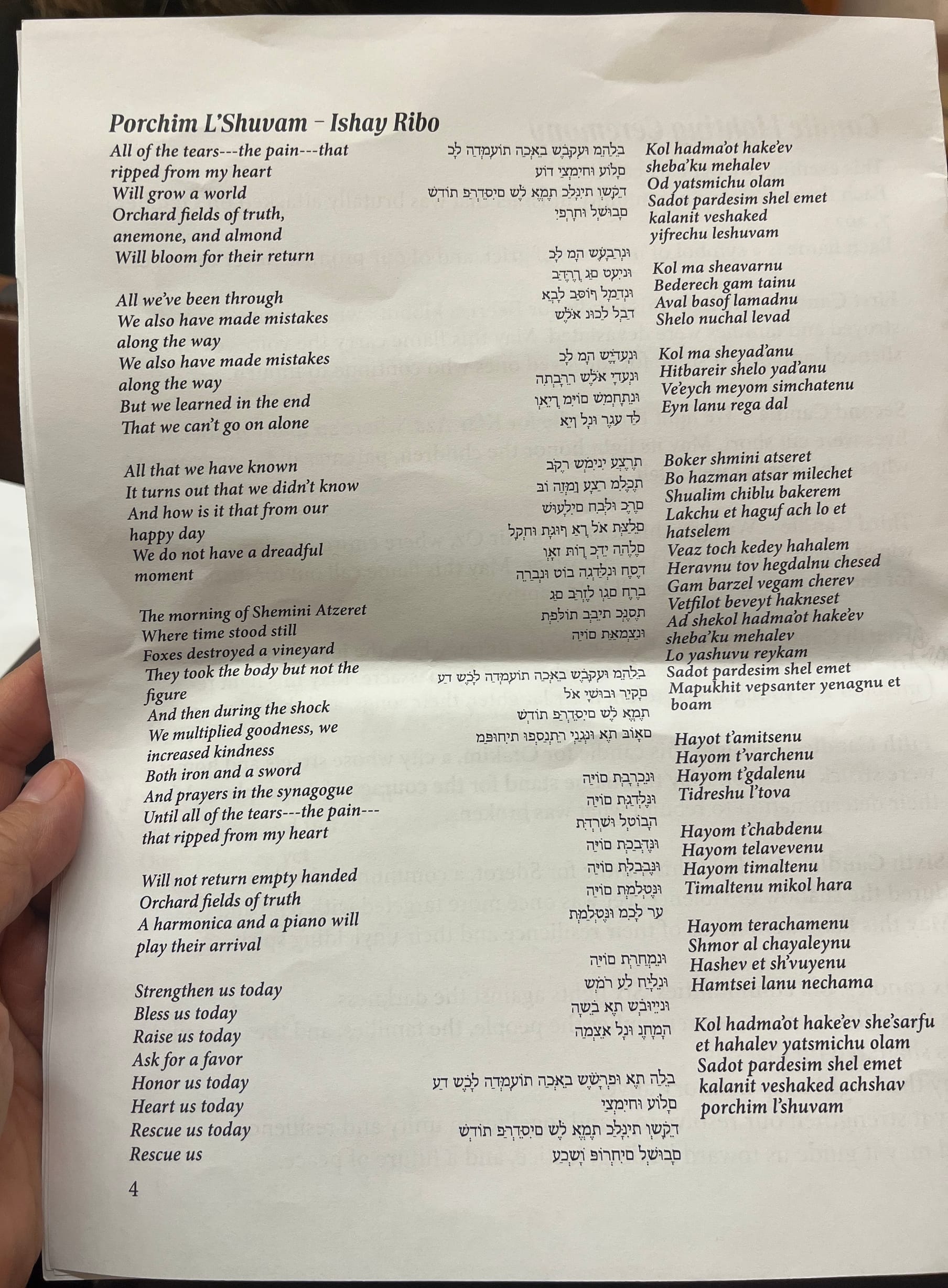 Follow along with the written lyrics to Porchim L'Shuvan, with translation and transliteration, as provided in the program that evening: