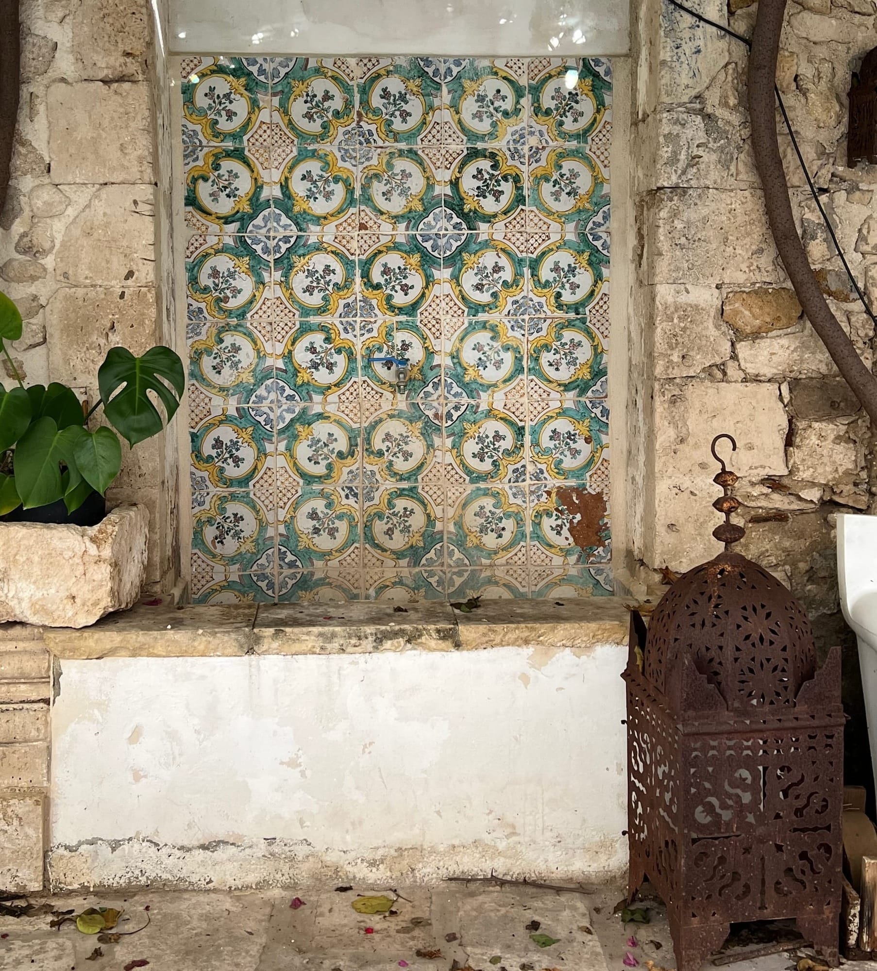 I knew I had to go back. I had to meet Amalia, and I had to photograph the Mikveh and have some of my questions answered. And so we returned to Ortigia at the beginning of November 2025. We had traveled so far to meet Amalia, and in my own, not perfect but heartfelt Italian, I told her how grateful I was to her for her discovery and subsequent research about the Mikveh and the Jewish history of the area. She was elegant and very gracious and welcoming. She answered my questions and the next day showed me the courtyard and what had once been the doorway that led from the home of the rabbi and the Mikveh to the synagogue. The doorway had been boarded up at the time of the Inquisition, and now there is just a decoratively tiled part of the wall that hides what had been the passageway between these two important buildings of Jewish life. It was exciting and validating to know that my instinct was correct. There had been a passageway.