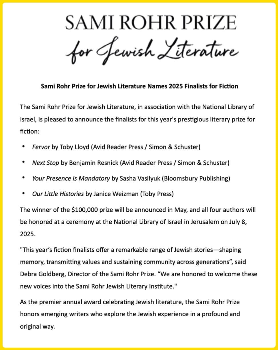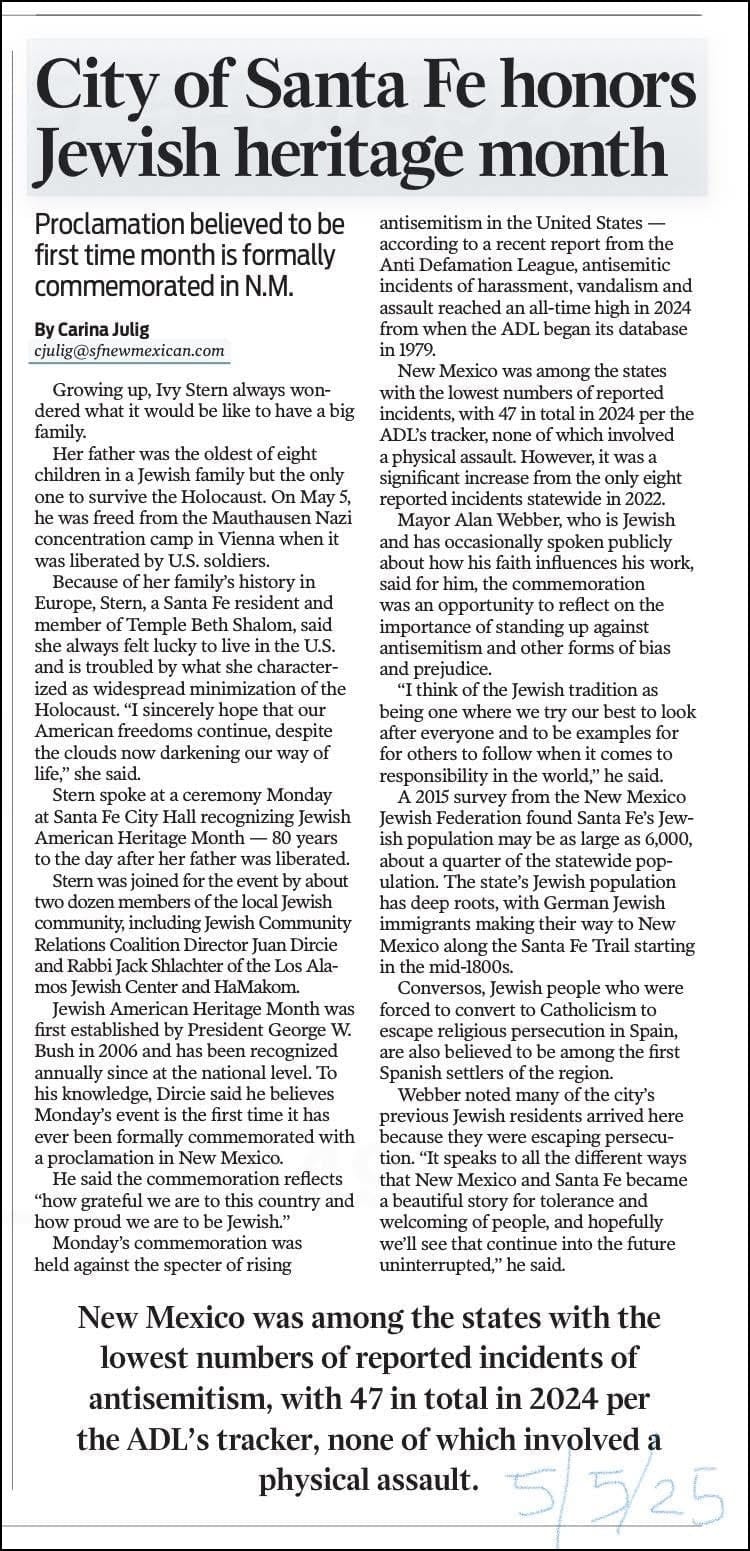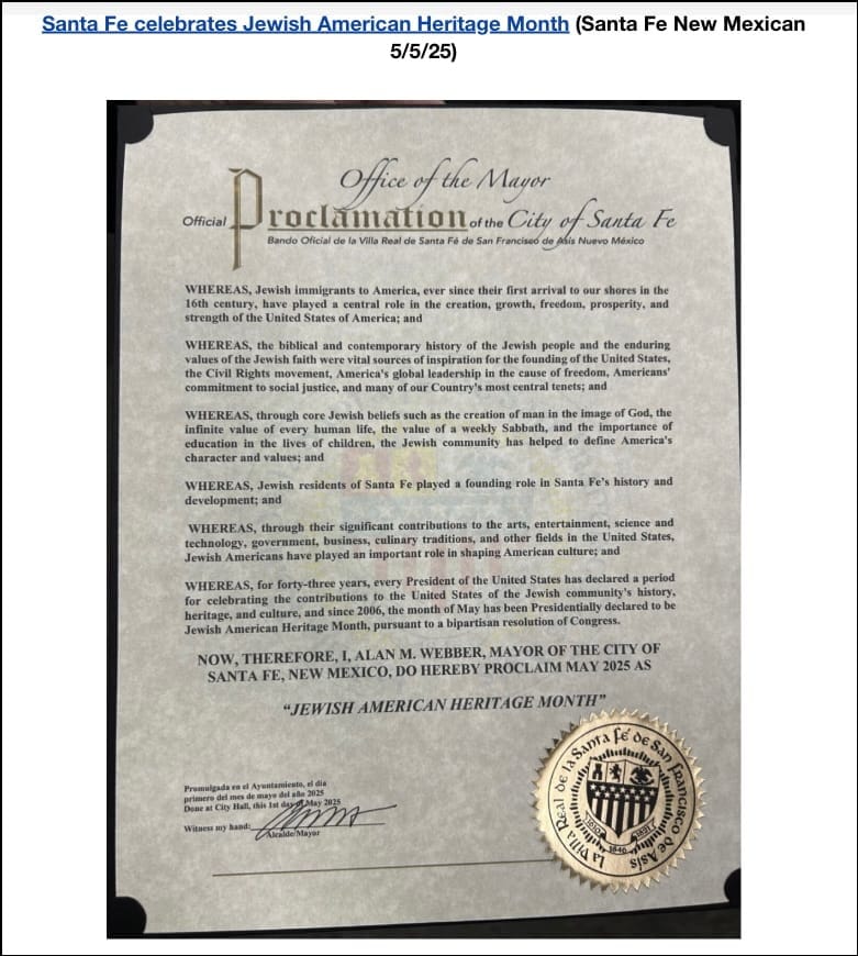 Noted: Two Rockower Awards for Excellence in Jewish Journalism won by NM Jewish Journal writers ~ Jewish Heritage Month Proclamation presented by Santa Fe Mayor Alan Webber and reported by SF New Mexican ~ Sami Rohr Prize $100,000 Fiction Finalists.