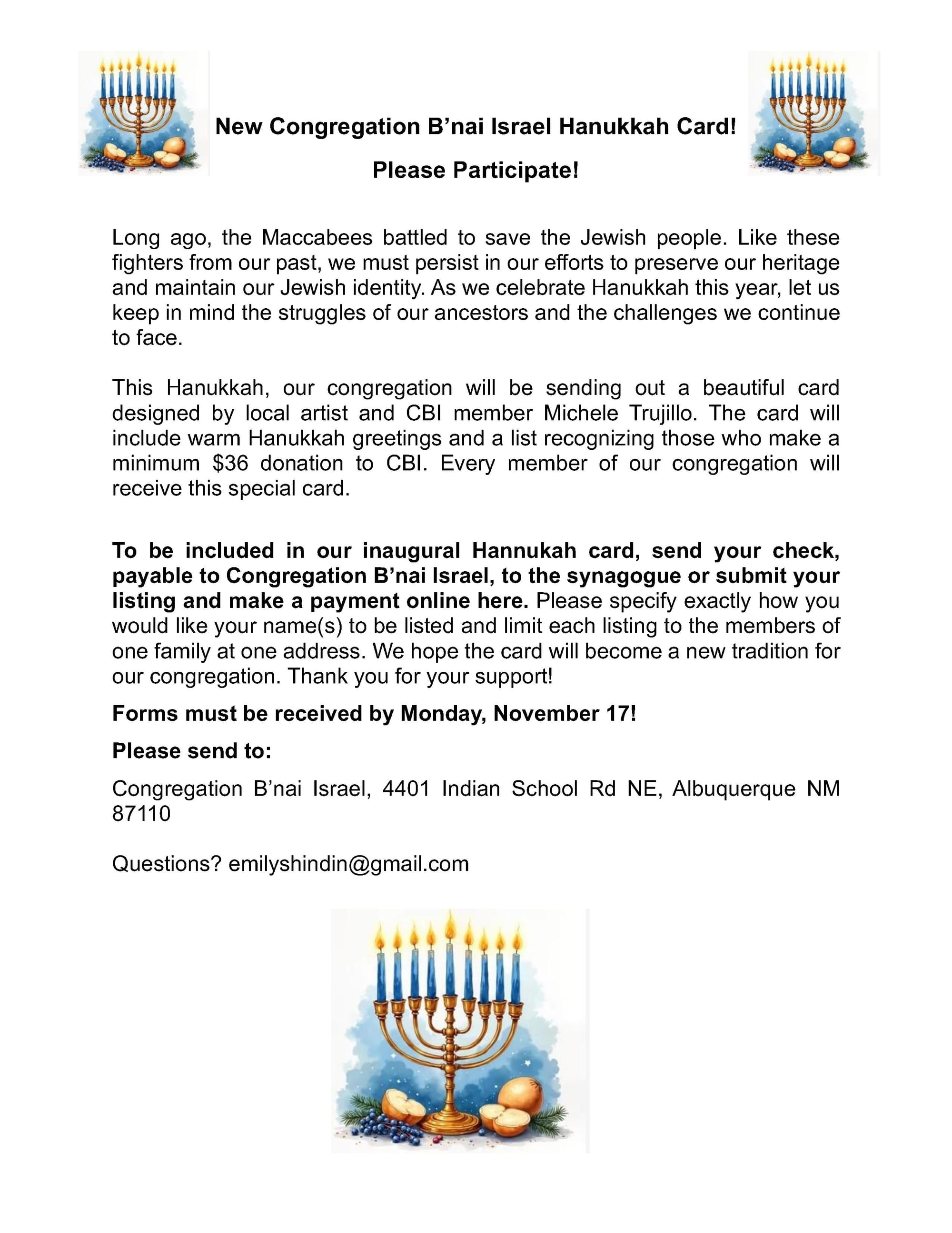 ALSO - BY NOV. 17th - SIGN THE CHANUKAH CARD: