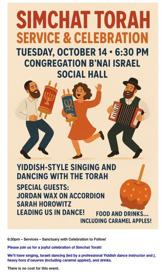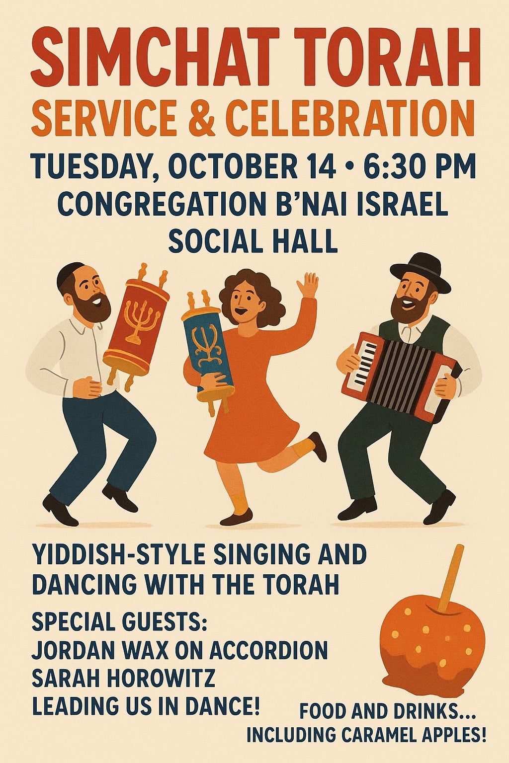 B'NAI ISRAEL SIMCHAT TORAH CELEBRATION TUES. OCT. 14TH 6:30
