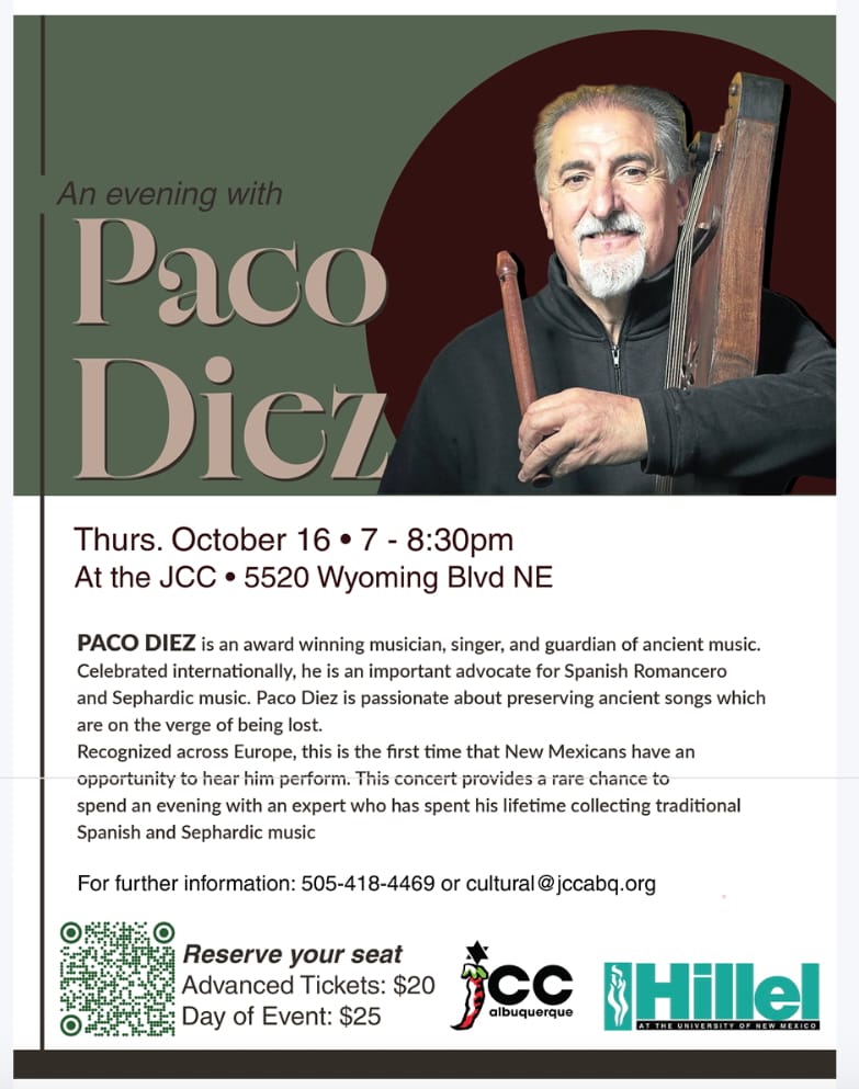 We hope that you can join Hillel House and the JCC for a concert with a world-renowned Spanish musician. Paco Diez is celebrated internationally as one of the major advocates of Spanish Romancero and Sephardic music. This is a wonderful opportunity to enjoy the performance of an expert who has spent his lifetime collecting traditional Spanish and Sephardic music.