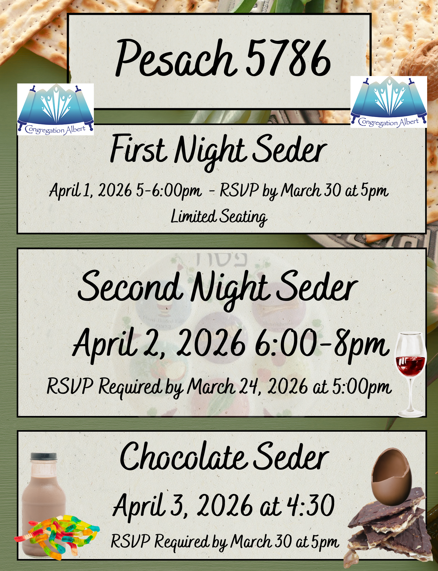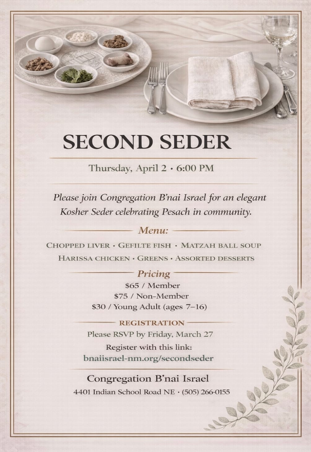 The First night of Passover begins April 1st, 2026. First Night Seders are on April 1st and Second Night Seders are on April 2nd. We will be updating to include many more locations and information as we receive them and fleshing out this post this month. Send your formal flyers with link information, to editor@nmjewishjournal.com.