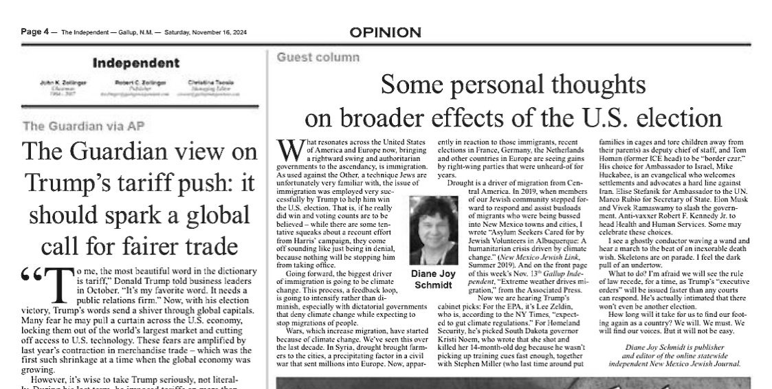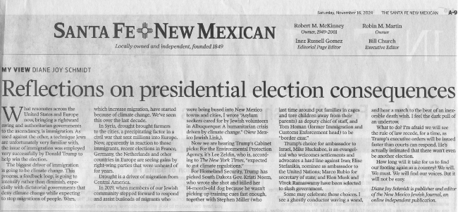 Subsequent to its first publication as the lead column in the NM Jewish Journal November 13 Newsletter, the column also appeared on the OpEd pages of the weekend editions of the Santa Fe New Mexican and the Gallup Independent newspapers.