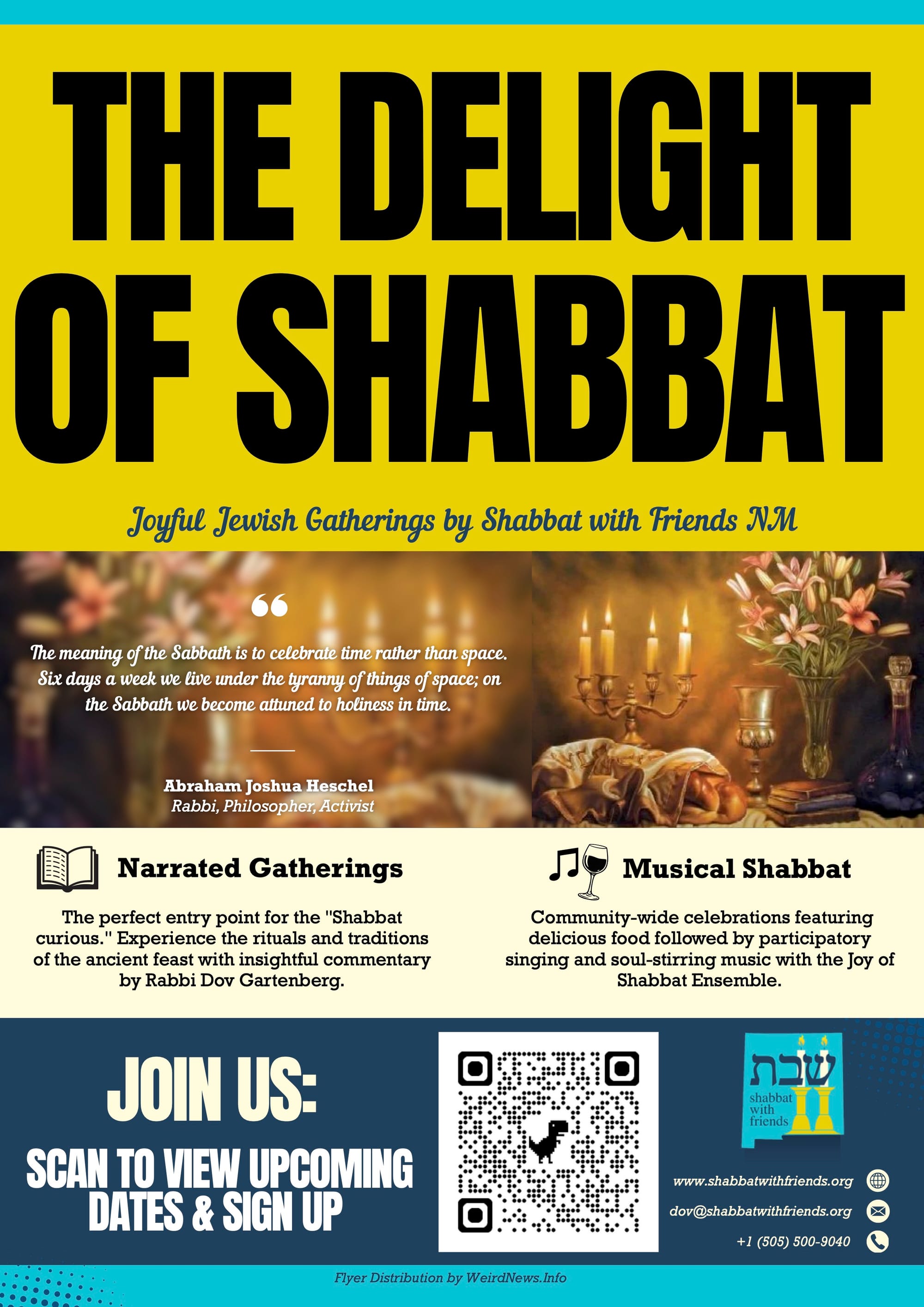 Learn about our Shabbat Gatherings in Santa Fe and Albuquerque at https://shabbatwithfriends.org. The mission of Shabbat with Friends is to recapture together the joy of Shabbat (Oneg Shabbat):