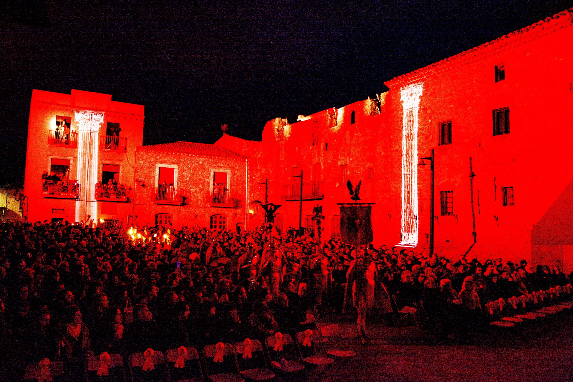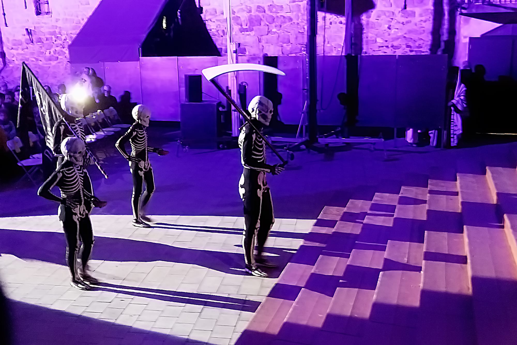 In spite of my horror, the story onstage was very moving, from beginning to end, and after the first half we saw the famous, ancient Dance of Death, which locals told me is only performed in Verges. Five figures appear, dressed in black clothes emblazoned with white skeletal bones and skull masks. They performed a very silent dance, lifting their legs and setting them down very precisely, in synchronized steps. The soundlessness made it even more eerie. Roman soldiers watched attentively from the ramparts. Images of death were projected on the stone walls. Behind the dancers were skeletal figures draped in black. Death comes to accompany Jesus through the humiliation, beating, and crucifixion that will follow. Death is his companion. He may be abandoned by humans, but he is not alone. And when he falls to his knees and sobs to God, it is wrenching. The audience watches, transfixed. It has to be one of the most emotional stories ever told. The audience knows what will happen, but they are gripped by the human drama onstage. And even though the play is performed in Catalonian verse, Paul and I could understand a lot of it.