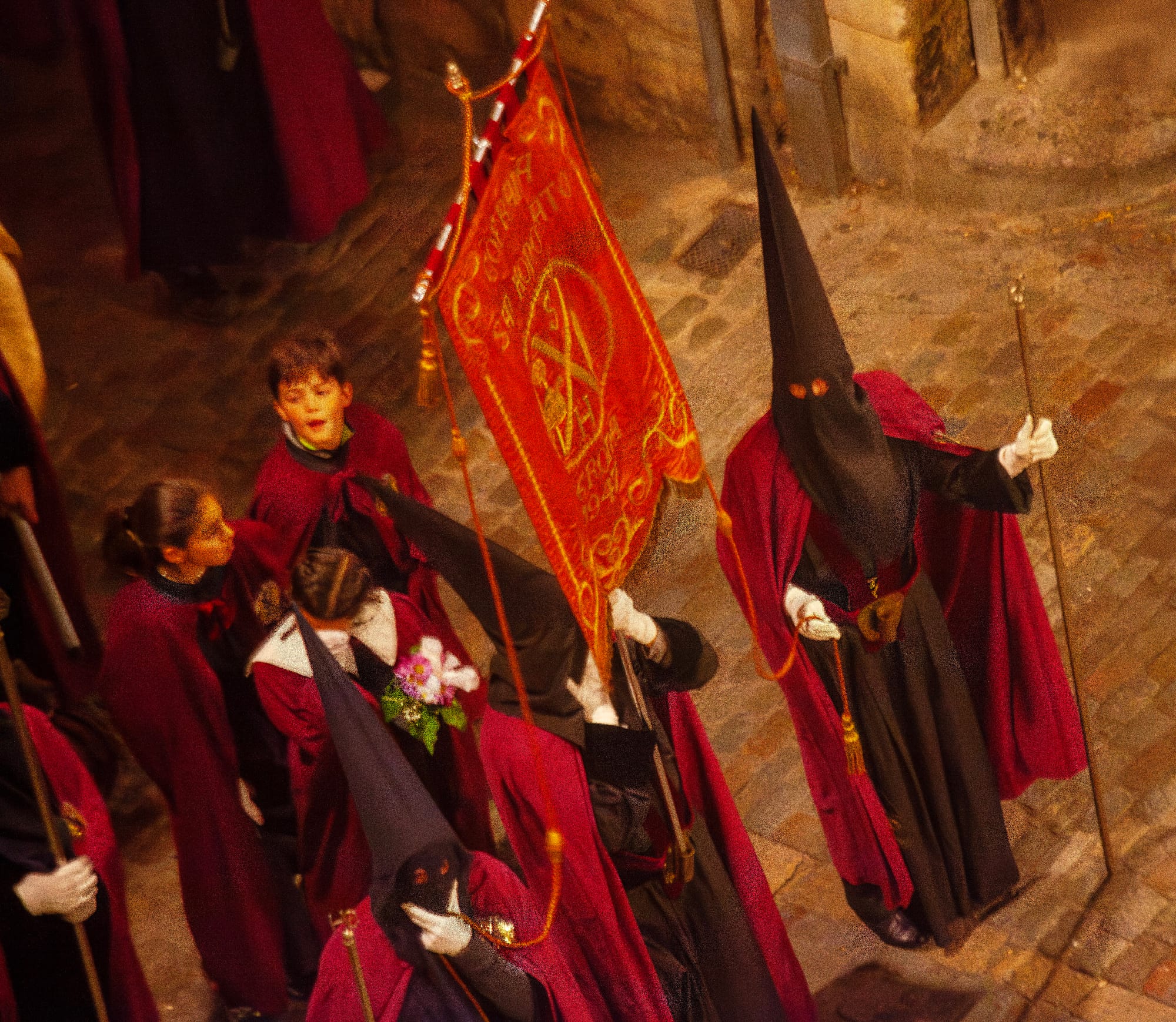 We walked with them thru the streets to the historic part of Girona and the cathedral. Suddenly we were backstage in the cathedral, where figures in pointed hoods in different colors with material masks and cowls that completely covered their faces, were preparing for the event. They looked exactly like a technicolor Ku Klux Klan. The bishop walked out in front of them, with his shepherd’s crook. But we couldn’t take our eyes off the masked and hooded penitents. They all exited the church and climbed down the 89 stone steps before disappearing.