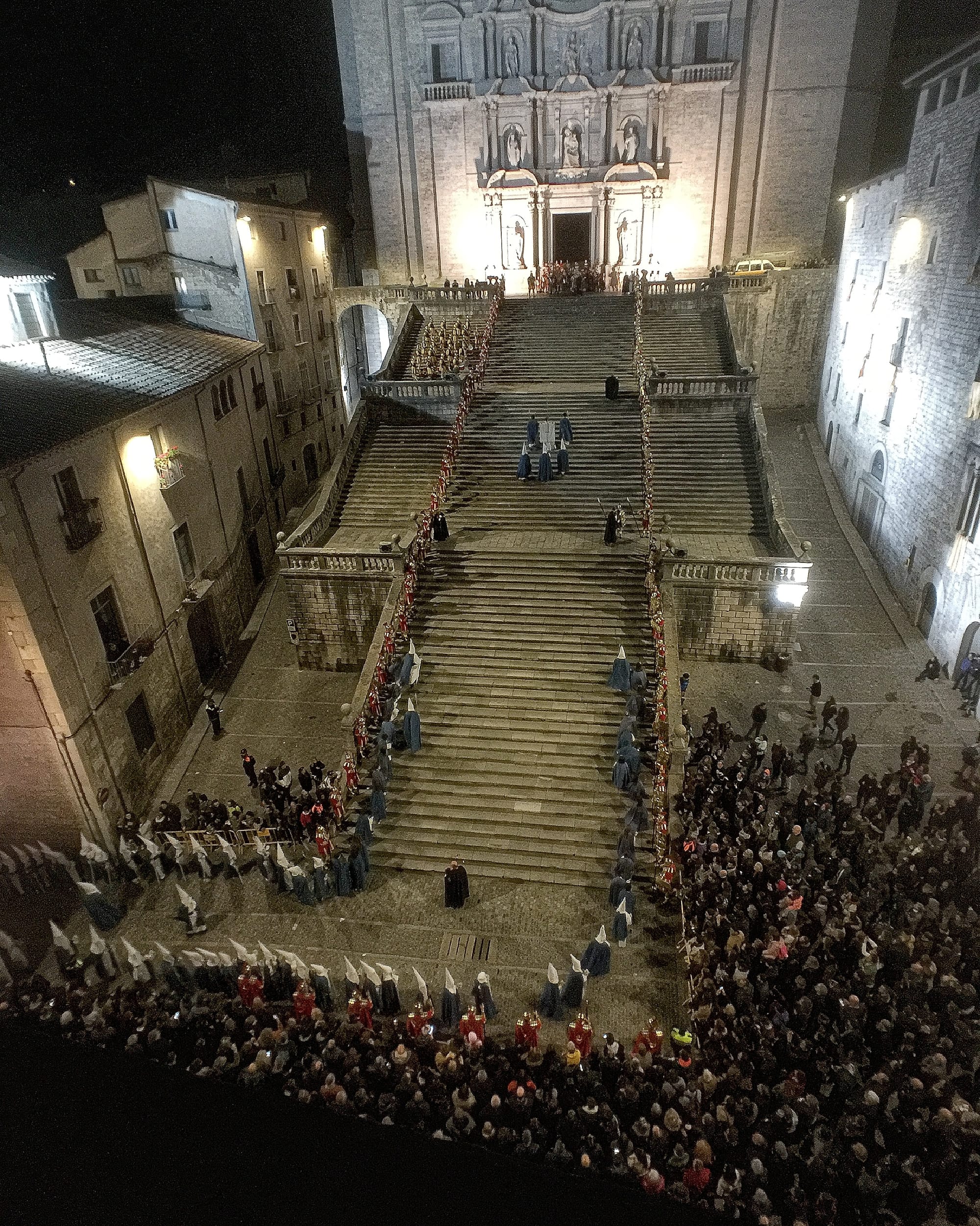 Then we entered a building directly across from the cathedral, and climbed up six flights. I was out of breath and Josep bounded along. When we got to the top, Roc whispered to me that we might be cold, and we headed out onto the roof. The entire Good Friday played out right below us. First there were Roman soldiers, with their cold, brutal, loud, pounding, synchronized marching gait and lances. They lined the flights of steps that led to the cathedral. Then there were group after group of cofradias (fraternal organizations) dressed in differently-colored pointed hoods and robes. When you didn’t think there could be any more groups, another ten or fifteen appeared. They all gathered on the long staircases of the cathedral. And everything took place directly below us. I was folded over the balcony like an inverted umbrella handle, watching, watching, wondering if there were any citizens left in Girona because it seemed like thousands were in the pageant.