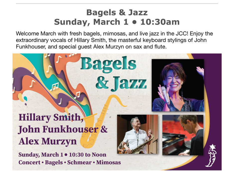 SUN MARCH 1st JCC 10:30 am BAGELS & JAZZ ~ SWEET JAZZ