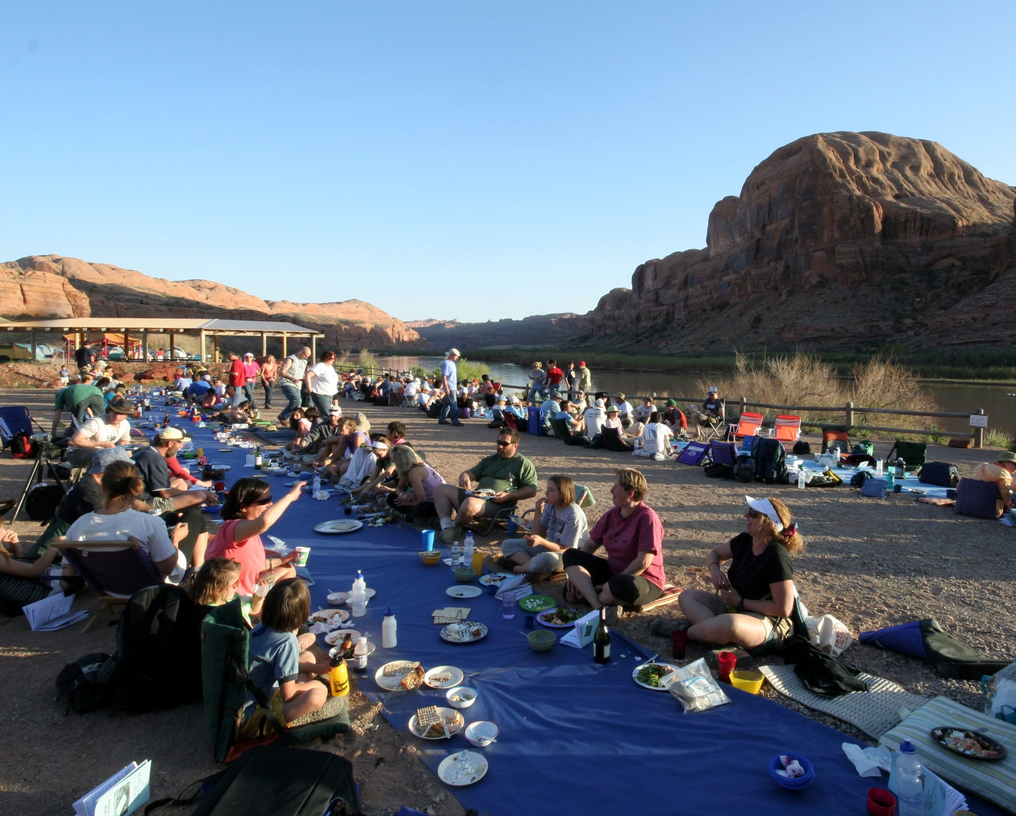 The adventure class, together with their families and all members of the congregation, hike a mile to a canyon in the desert where the seder begins under a natural, 100-foot-tall sandstone arch. As the Torah is completely unrolled, each member holds a portion of the parchment while the rabbi and members read the Torah portion.