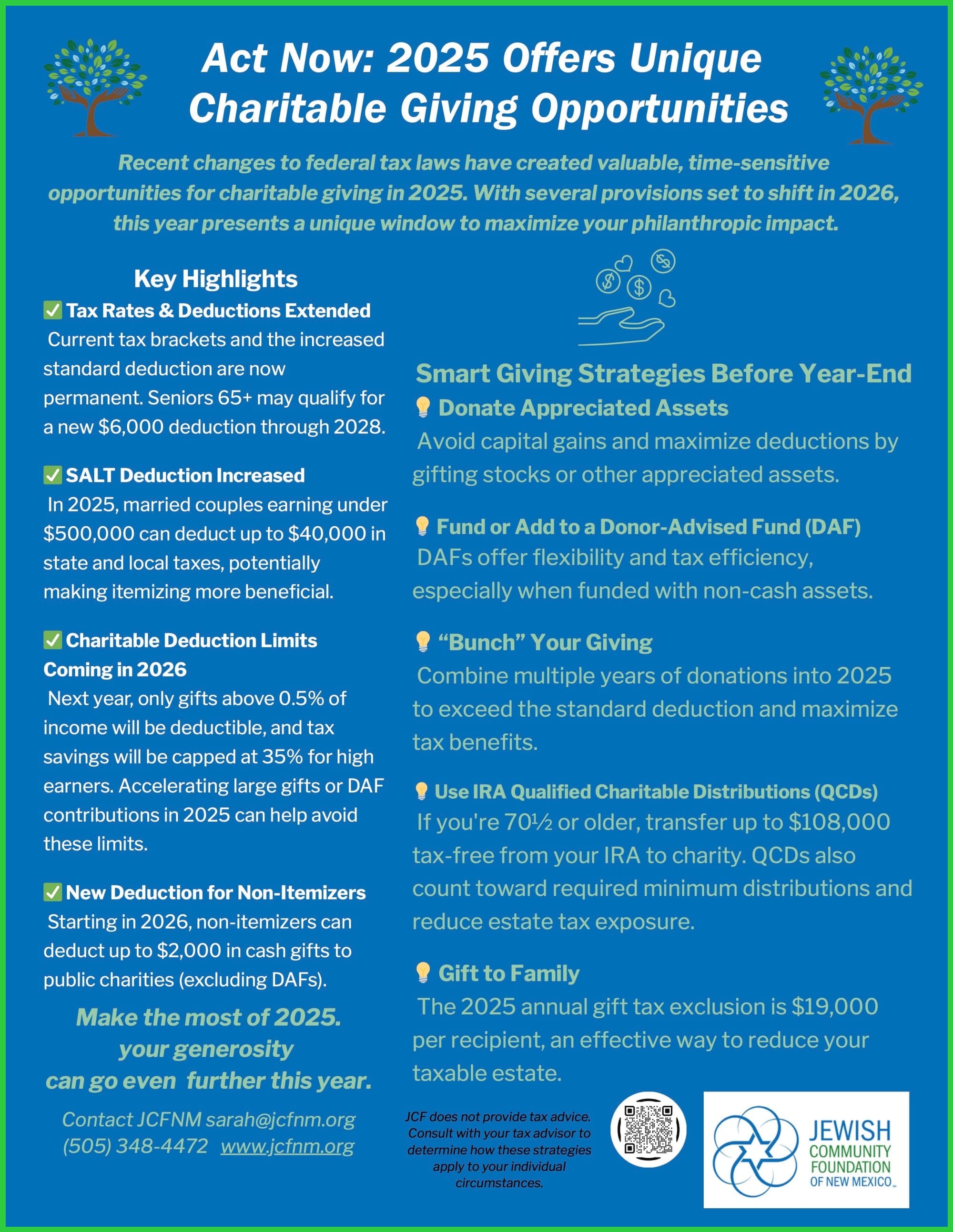 JEWISH COMMUNITY FOUNDATION OF NEW MEXICO ~ ACT NOW for 2025: Unique Charitable Giving Opportunities ~ JCF Grants to Immigrant and Refugee Organizations ~ NM on track to create $6.8 million in endowed gifts ~ Meet: Sarah Winger, new Executive Director