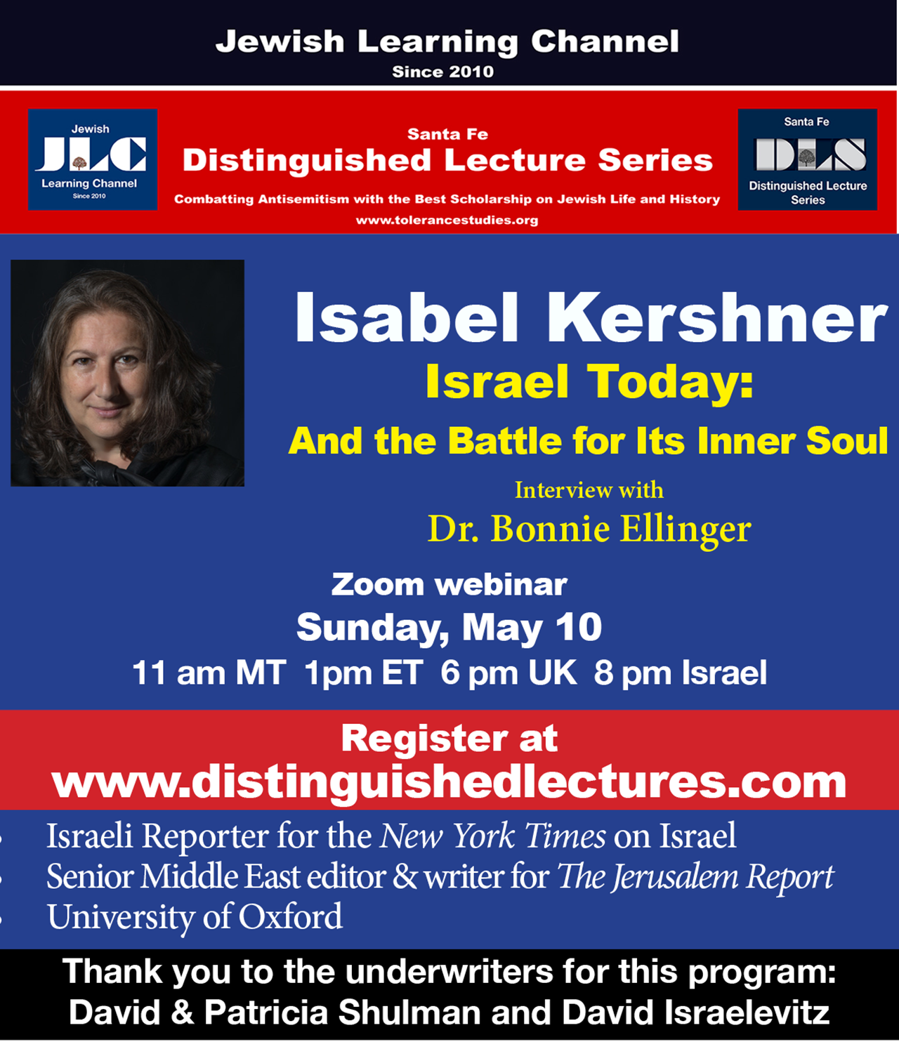 May 10: New York Times Reporter Isabel Kershner, Israel Today, and the Battle for Its Inner Soul. Interview with Dr. Bonnie Ellinger.