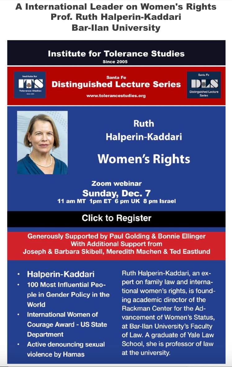 DEC. 7th WOMEN'S RIGHTS with INTERNATIONAL LEADER PROF. RUTH HALPERIN-KADDARI, BAR-IIAN UNIVERSITY, ISRAEL ~ View Latest Recordings on the JEWISH LEARNING CHANNEL: REMBRANDT and the JEWS; YIDDISH THEATER; YIDDISH HUMOR ~ Distinguished Lecture Series