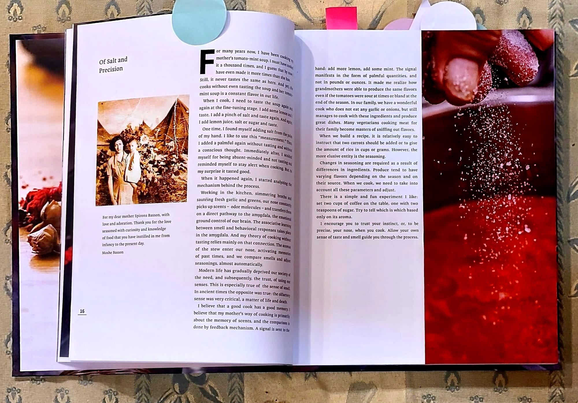 In “Of Salt and Precision,” Basson confesses a “mistake” he made while making his mother’s tomato-mint soup. Though he had made the soup thousands of times, it never tasted quite like hers. His mother cooked without measuring ingredients or tasting while cooking, yet her soup was not only uniformly delicious but consistent each time she made it.