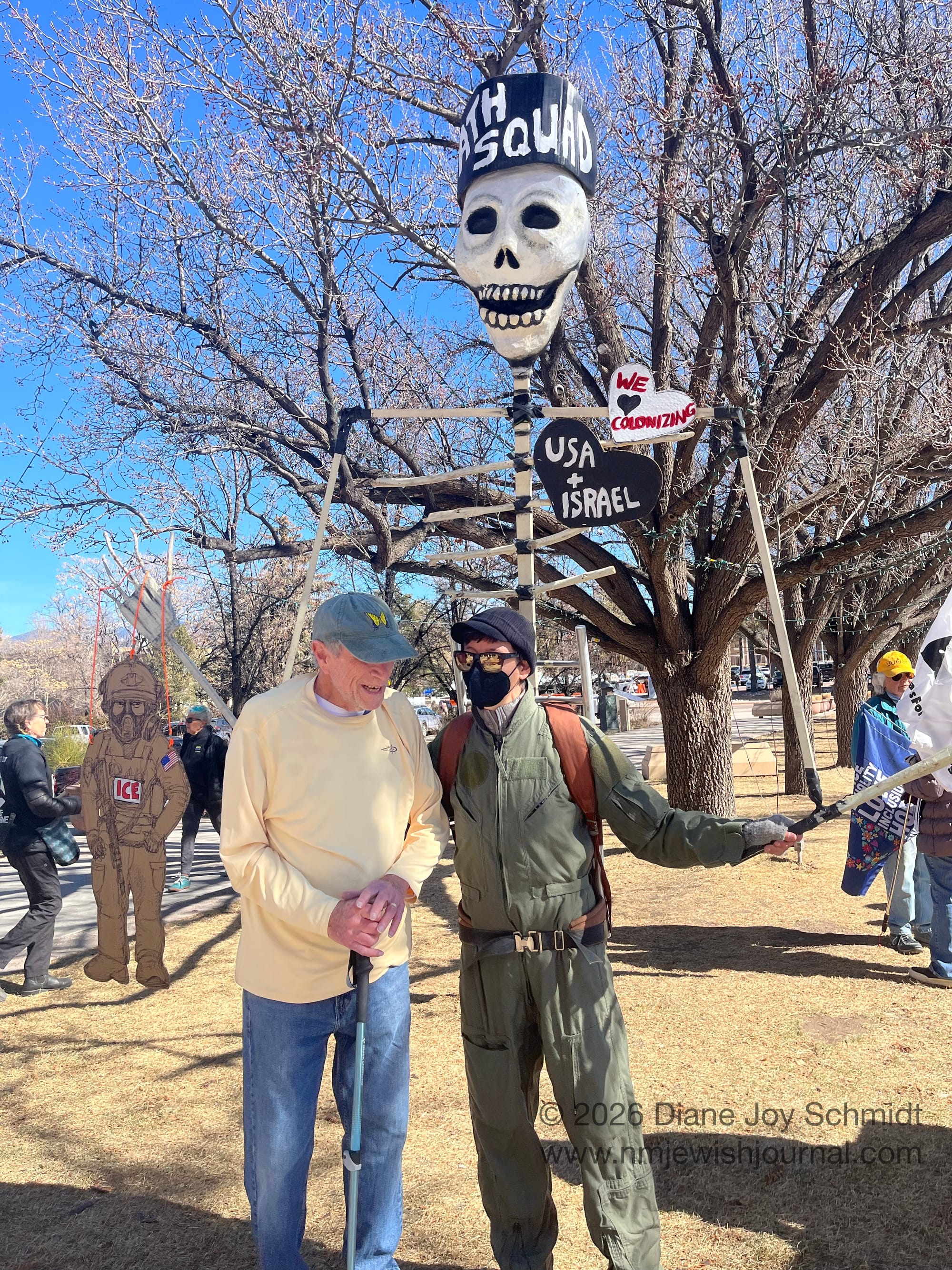 Jeff Haas, director of Santa Feans for Justice in Palestine, in green cap, with their weekly protest outside the Capital. Photos © 2026 Diane Joy Schmidt/NMJewishJournal.com. May not be reproduced without permission.