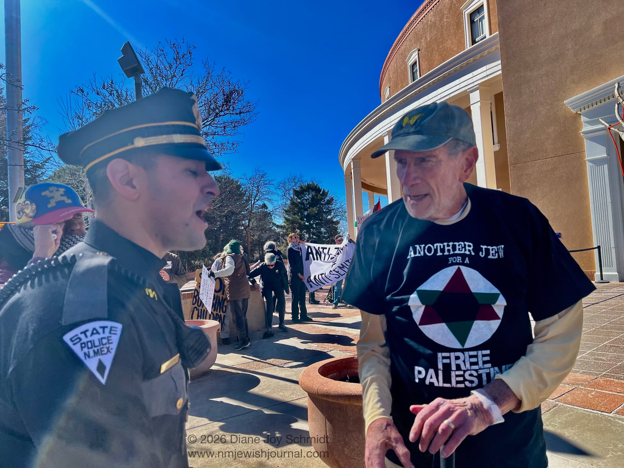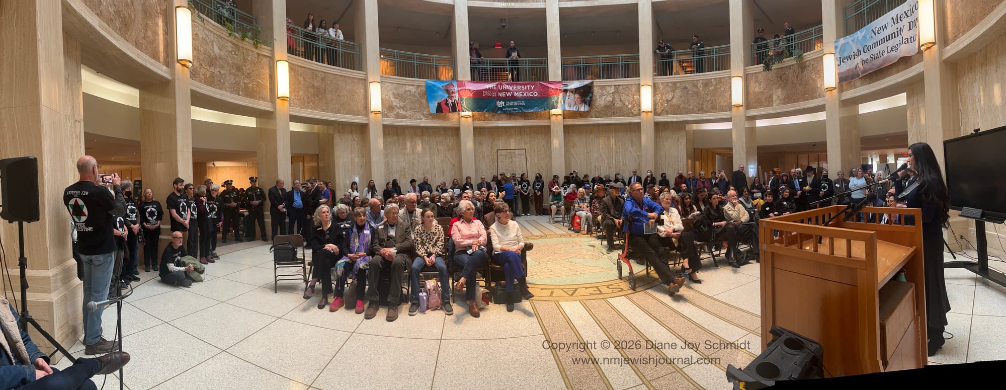 February 4, 2026 was declared New Mexico Jewish Community Day at the Roundhouse in Santa Fe, while the legislature was in session. Some twenty Jewish community organizations set up tables throughout the day in the West Hall — though not all were invited, and not all who were invited came. Those excluded arrived anyway, staging a silent protest around the seated audience in the Rotunda.