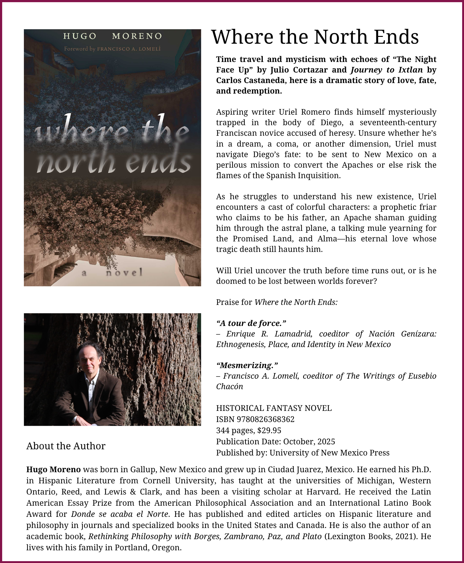 WHERE THE NORTH ENDS, A Novel by Hugo Moreno ~ Accused of being a heretic in 17th century New Mexico ~ forthcoming from UNM Press